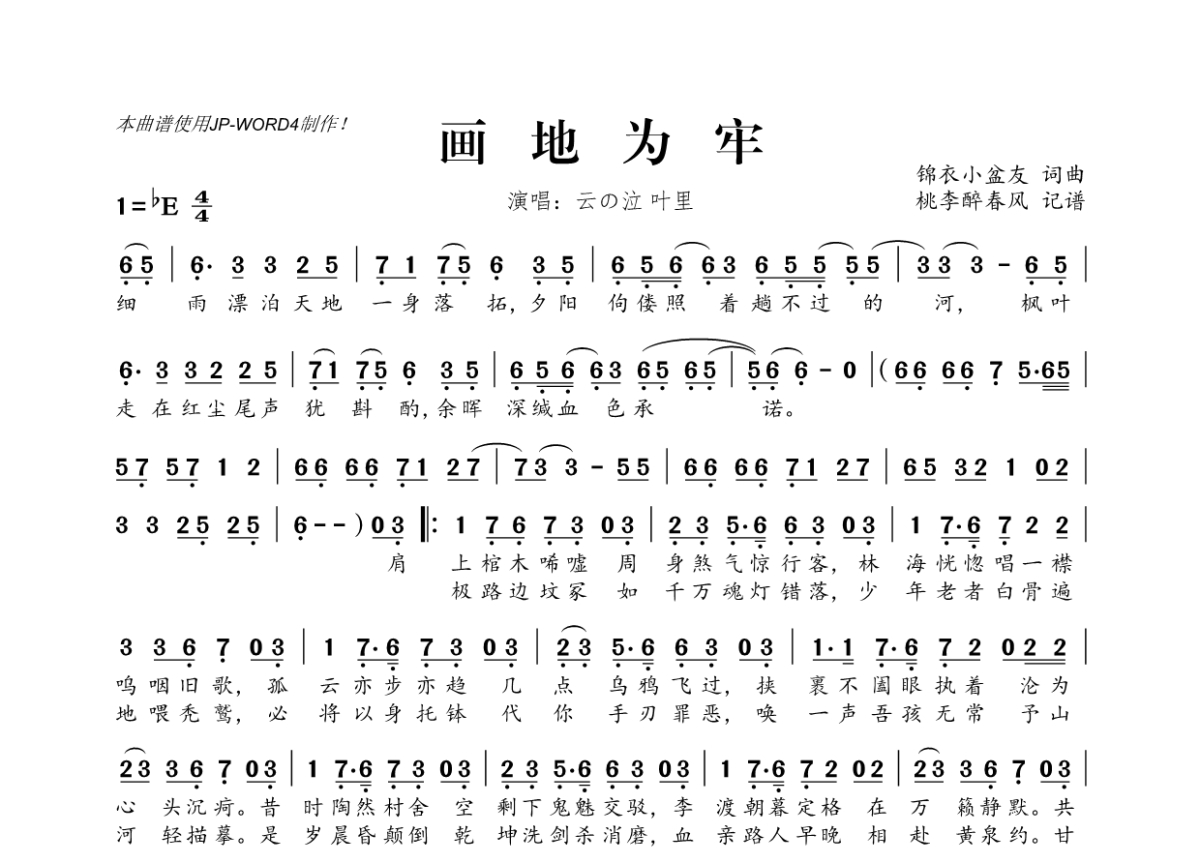 《画地为牢》是叶里&云之泣演唱的一首歌曲,拍号为4/4拍,这份简谱共有一张高清图谱,图谱由 @桃李醉春风 编配上传。