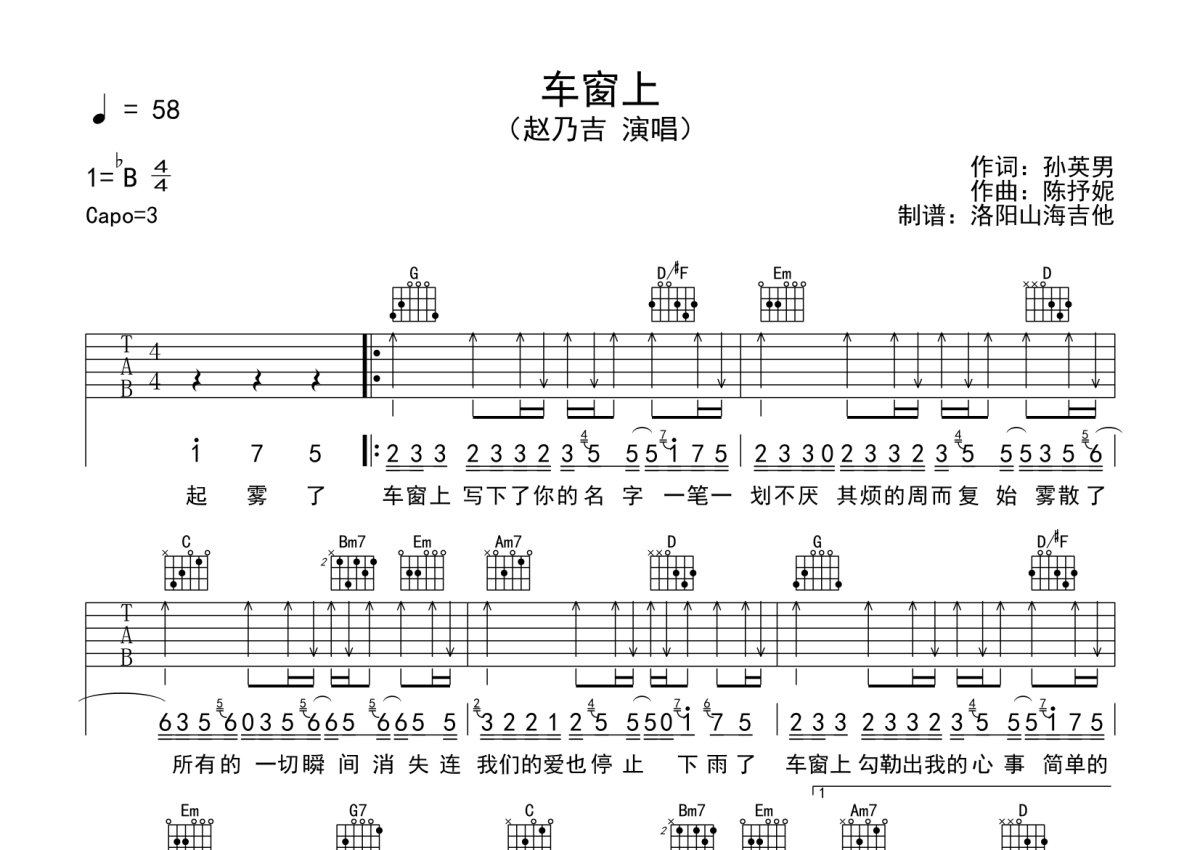 赵乃吉《车窗上》吉他谱 - G调弹唱六线谱