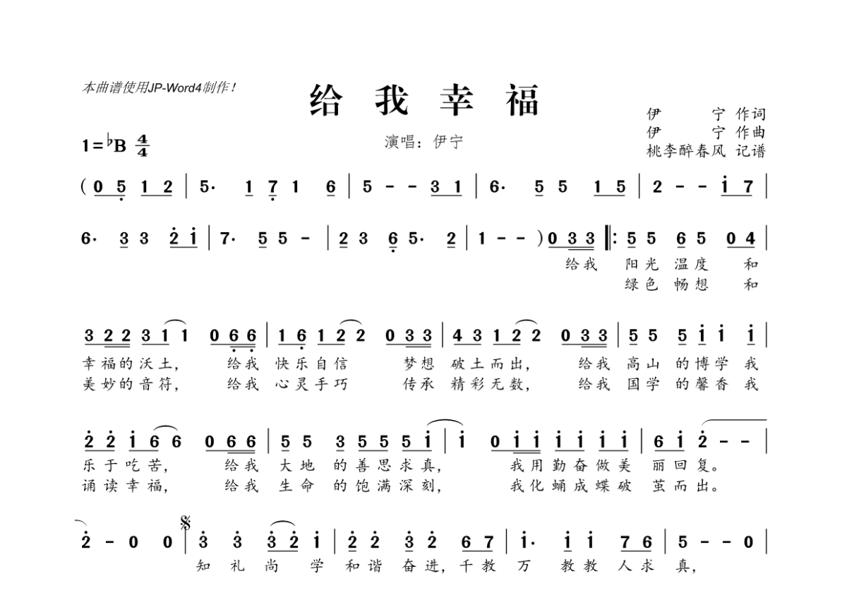 《给我幸福》是伊宁演唱的一首歌曲,拍号为4/4拍,这份简谱共有一张高清图谱,图谱由 @桃李醉春风 编配上传。