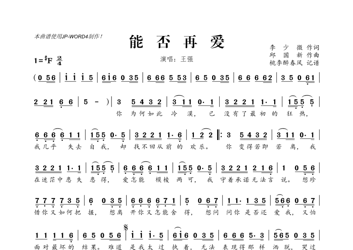 《能否再爱》是王强演唱的一首歌曲,拍号为2/4拍,这份简谱共有一张高清图谱,图谱由 @桃李醉春风 编配上传。