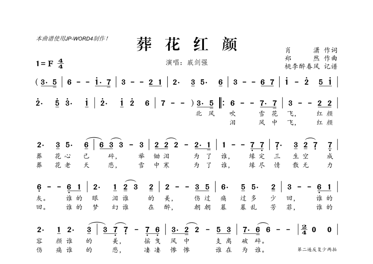 《葬花红颜》是戚剑强演唱的一首歌曲,拍号为4/4拍,这份简谱共有一张高清图谱,图谱由 @桃李醉春风 编配上传。