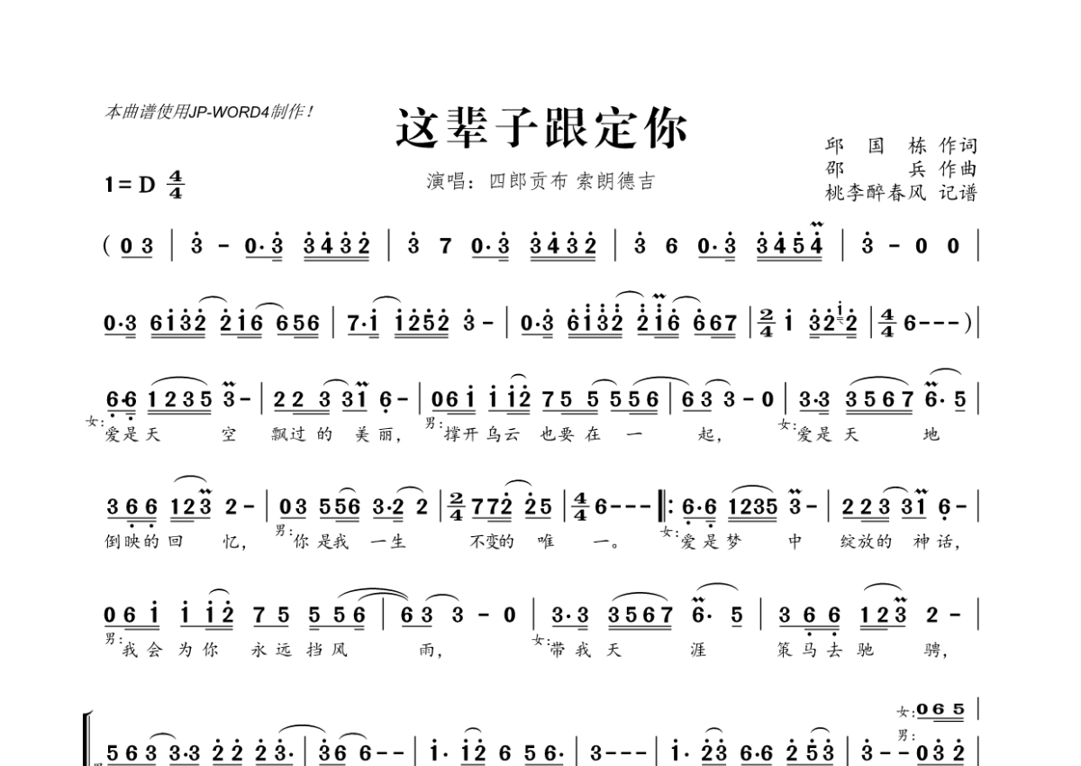 《这辈子跟定你》是四郎贡布&索朗德吉演唱的一首歌曲,拍号为4/4拍,这份简谱共有一张高清图谱,图谱由 @桃李醉春风 编配上传。