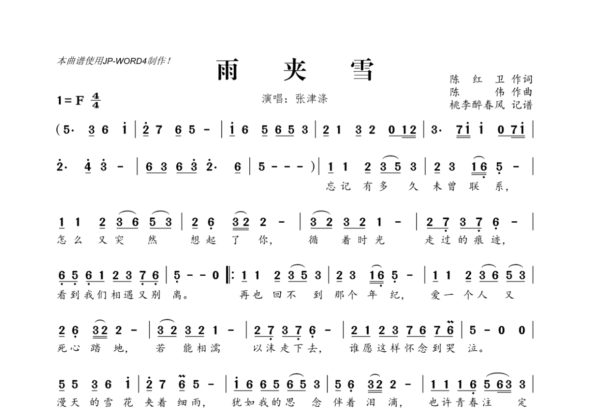 《雨夹雪》是张津涤演唱的一首歌曲,拍号为4/4拍,这份简谱共有一张高清图谱,图谱由 @桃李醉春风 编配上传。