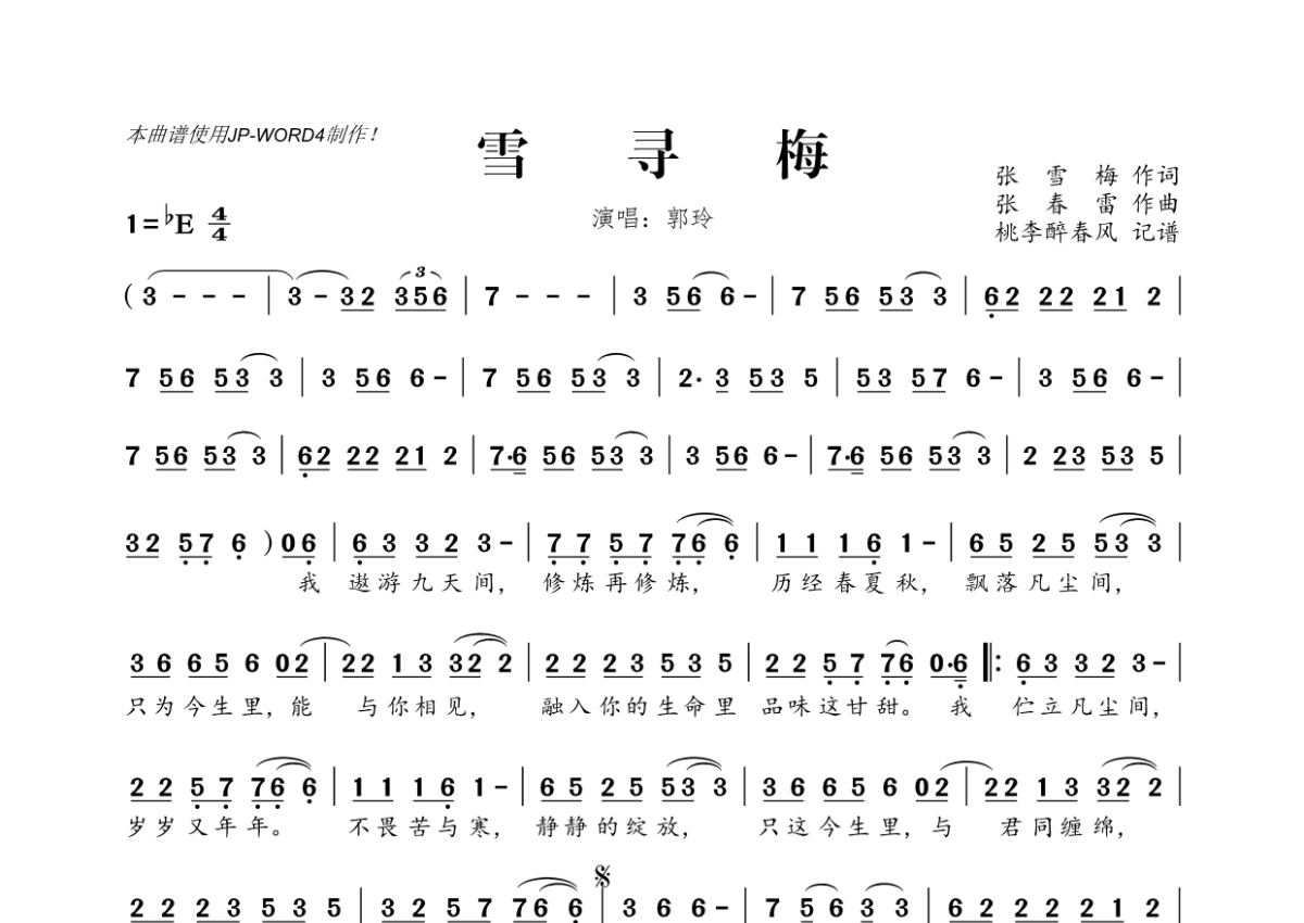 《雪寻梅》是郭玲演唱的一首歌曲,拍号为4/4拍,这份简谱共有一张高清图谱,图谱由 @桃李醉春风 编配上传。