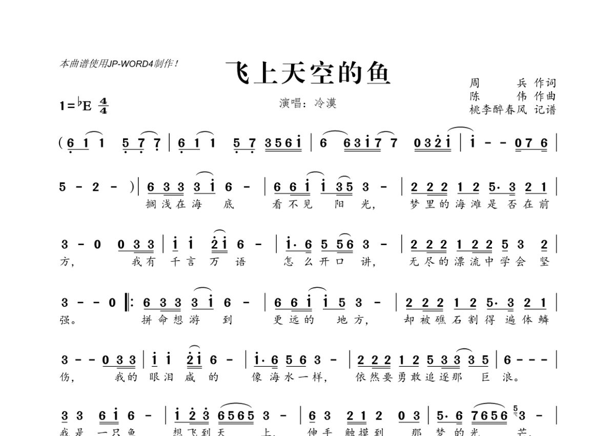 《飞上天空的鱼》是冷漠演唱的一首歌曲,拍号为4/4拍,这份简谱共有一张高清图谱,图谱由 @桃李醉春风 编配上传。