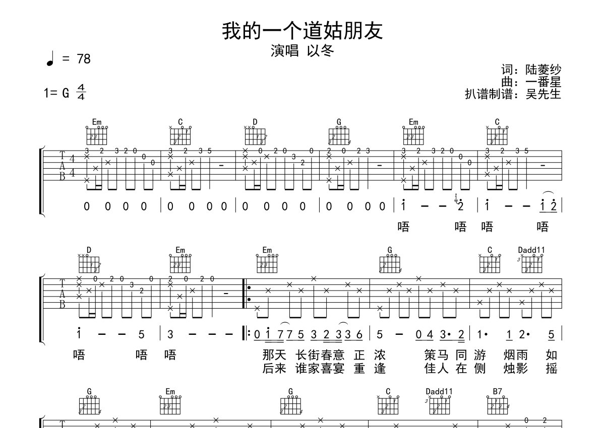 《我的一个道姑朋友》是以冬演唱的一首歌曲,本吉他谱采用的是G调指法编配,这份吉他谱共有三张高清图谱,图谱由 @吴先生TAB 编配上传,图谱使用六线谱编配,包含吉他和弦指法、简谱以及歌词部分,使用这份我的一个道姑朋友吉他谱,可以让你更加方便地掌握这首歌曲的弹唱技巧,快来尝试吧。 以冬《我的一个道姑朋友》吉他谱,G调指法编配,高清弹唱谱,我的一个道姑朋友六线谱,三张图片谱。 火遍网络的一首歌曲,无一爱字,却字字含情。以冬的声音,沁入灵魂的空灵,古色古香的中国风,勾勒出一个动态的烟雨画面,美景如墨般展开,爱情故事伴随着歌声一字一句的演绎,如梦似幻,如痴如醉。 。