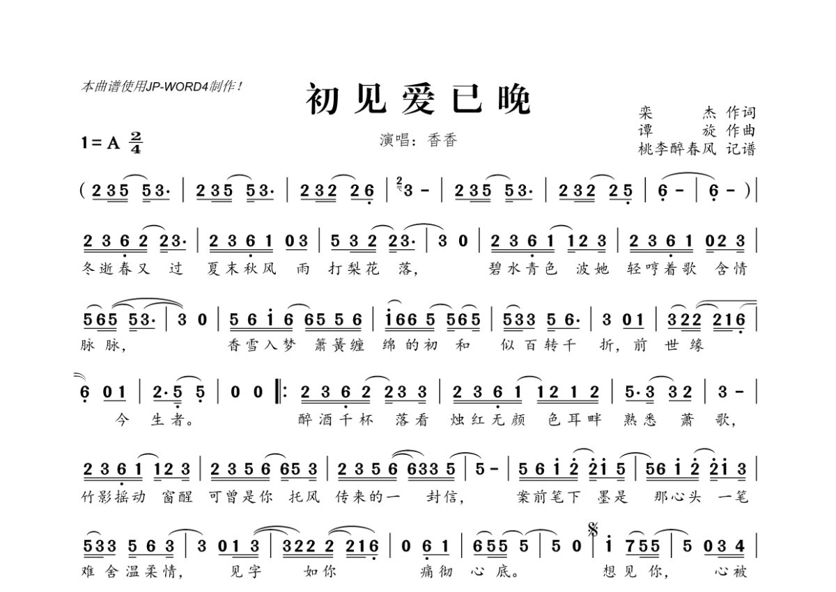 《初见爱已晚》是香香演唱的一首歌曲,拍号为2/4拍,这份简谱共有一张高清图谱,图谱由 @桃李醉春风 编配上传。
