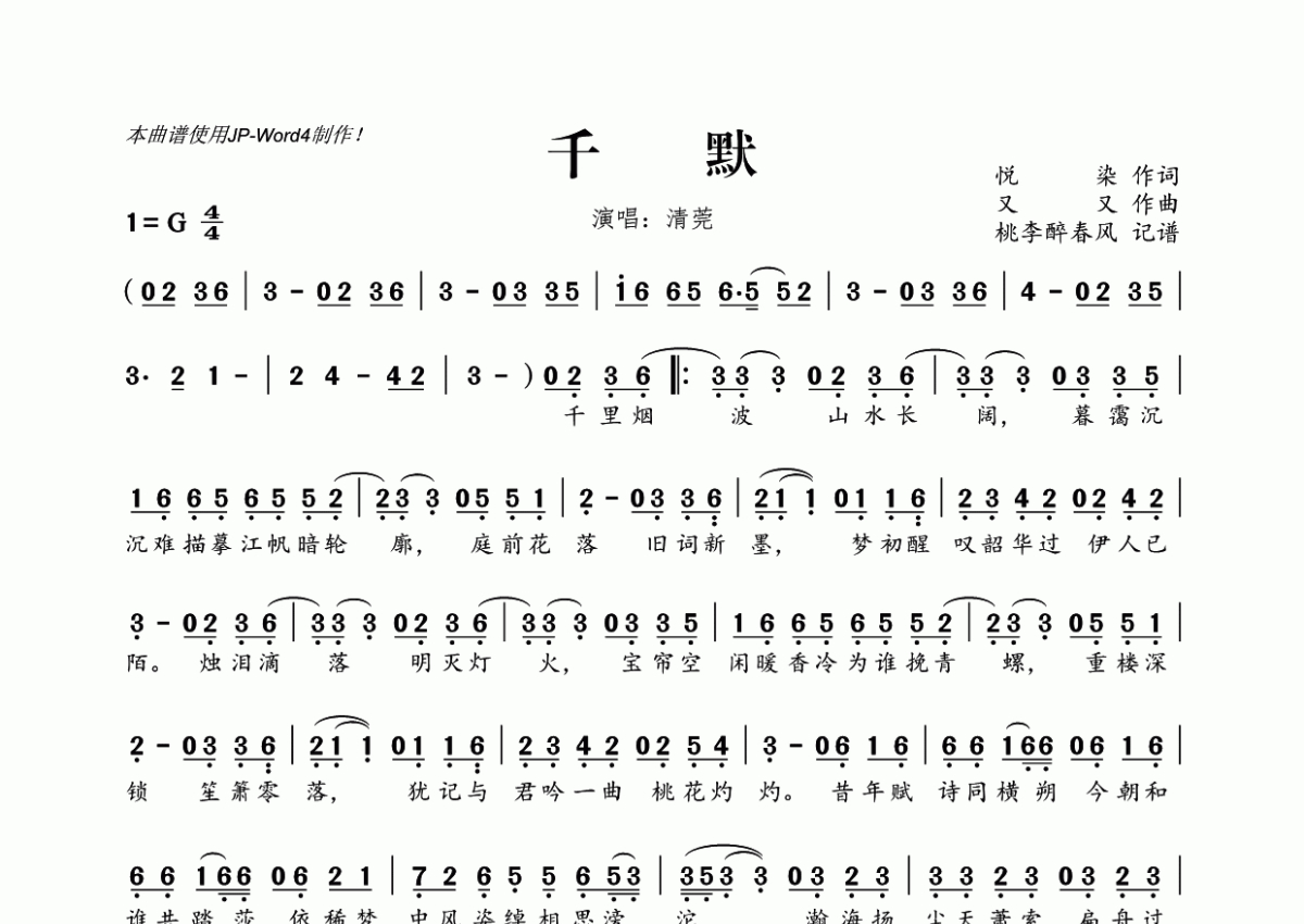 《千默》是清莞演唱的一首歌曲,拍号为4/4拍,这份简谱共有一张高清图谱,图谱由 @桃李醉春风 编配上传。