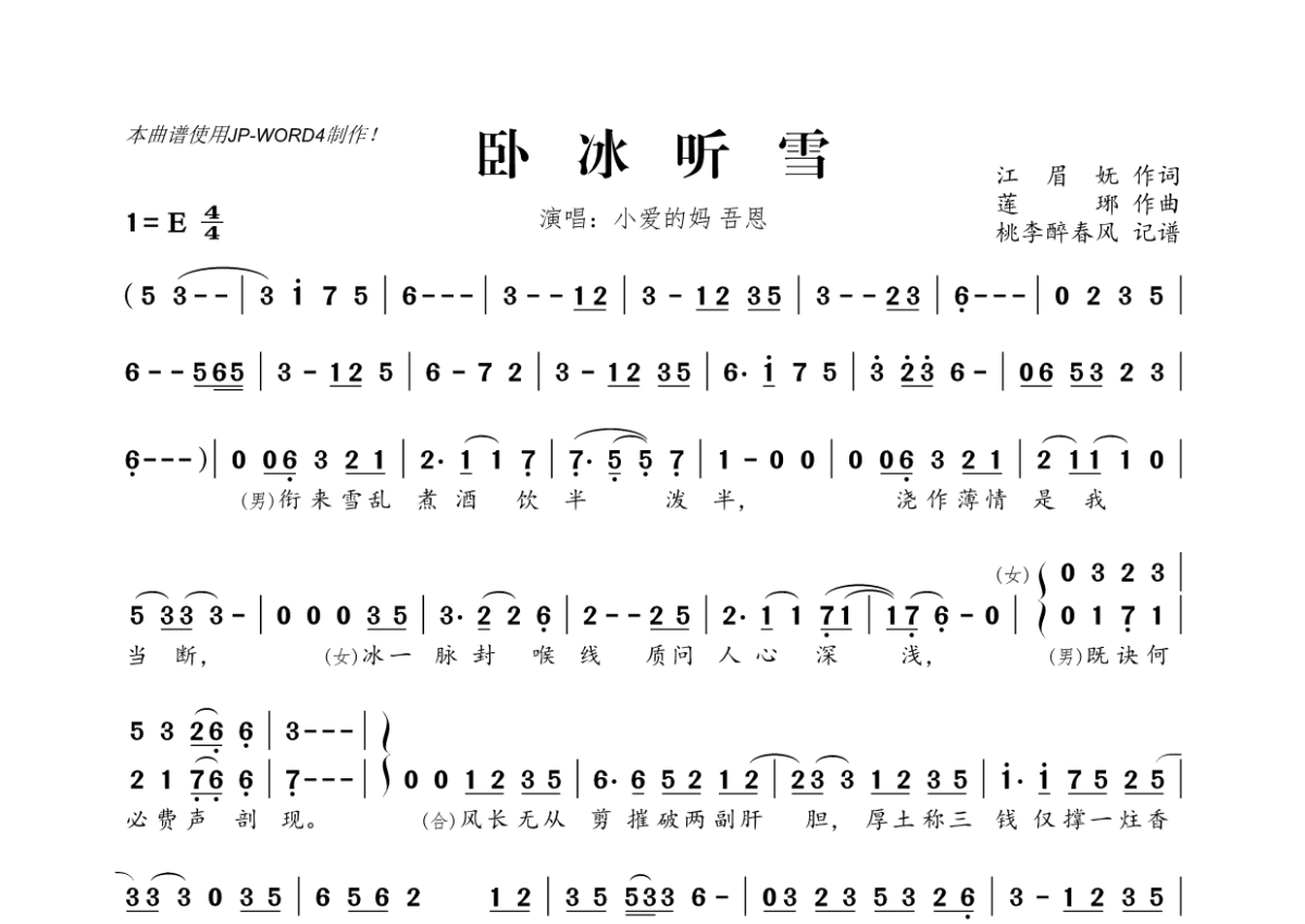 《卧冰听雪》是小爱的妈&吾恩演唱的一首歌曲,拍号为4/4拍,这份简谱共有两张高清图谱,图谱由 @桃李醉春风 编配上传。
