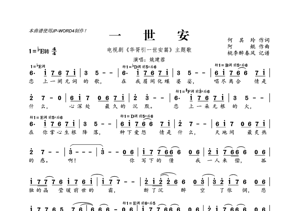 《一世安》是姚建蓉演唱的一首歌曲,拍号为4/4拍,这份简谱共有一张高清图谱,图谱由 @桃李醉春风 编配上传。