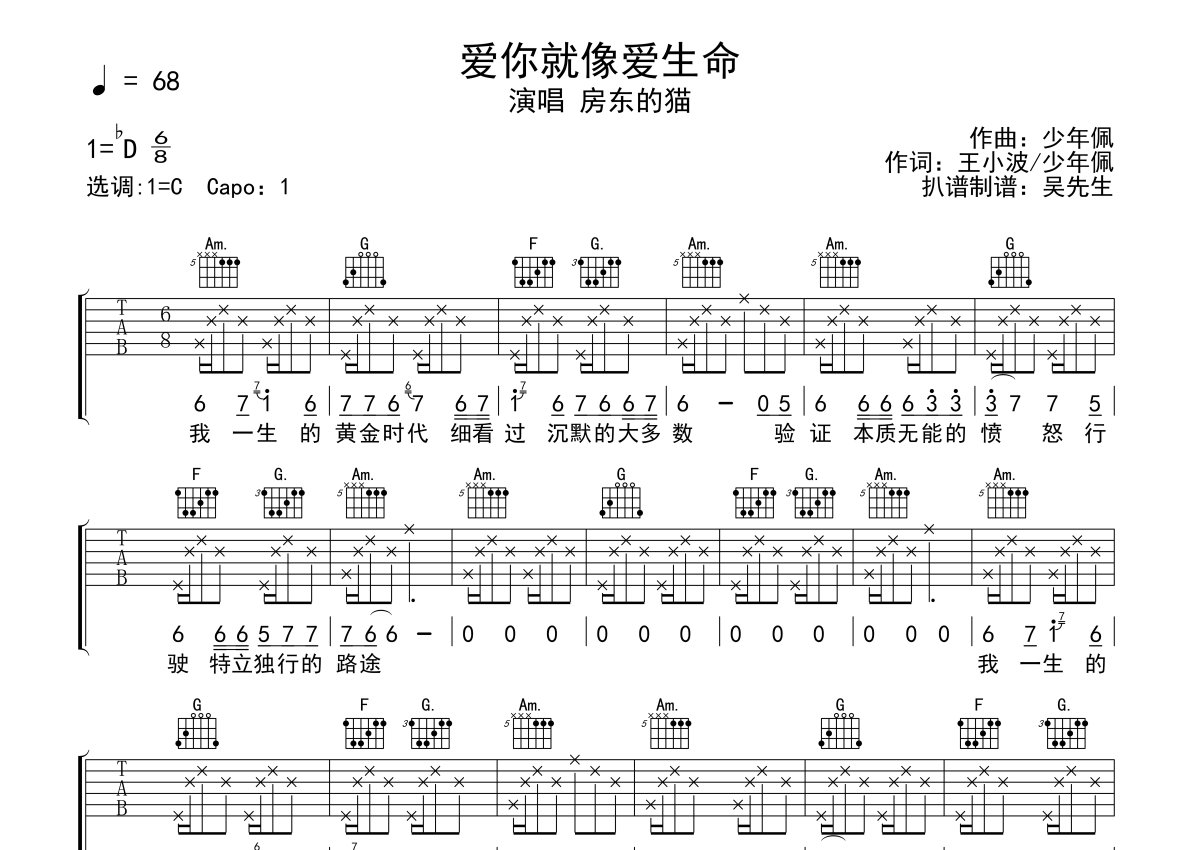 《爱你就像爱生命》是房东的猫演唱的一首歌曲,本吉他谱采用的是C调指法编配,这份吉他谱共有两张高清图谱,图谱由 @吴先生TAB 编配上传,图谱使用六线谱编配,包含吉他和弦指法、简谱以及歌词部分,使用这份爱你就像爱生命吉他谱,可以让你更加方便地掌握这首歌曲的弹唱技巧,快来尝试吧。房东的猫《爱你就像爱生命》吉他谱_C调吉他弹唱谱。