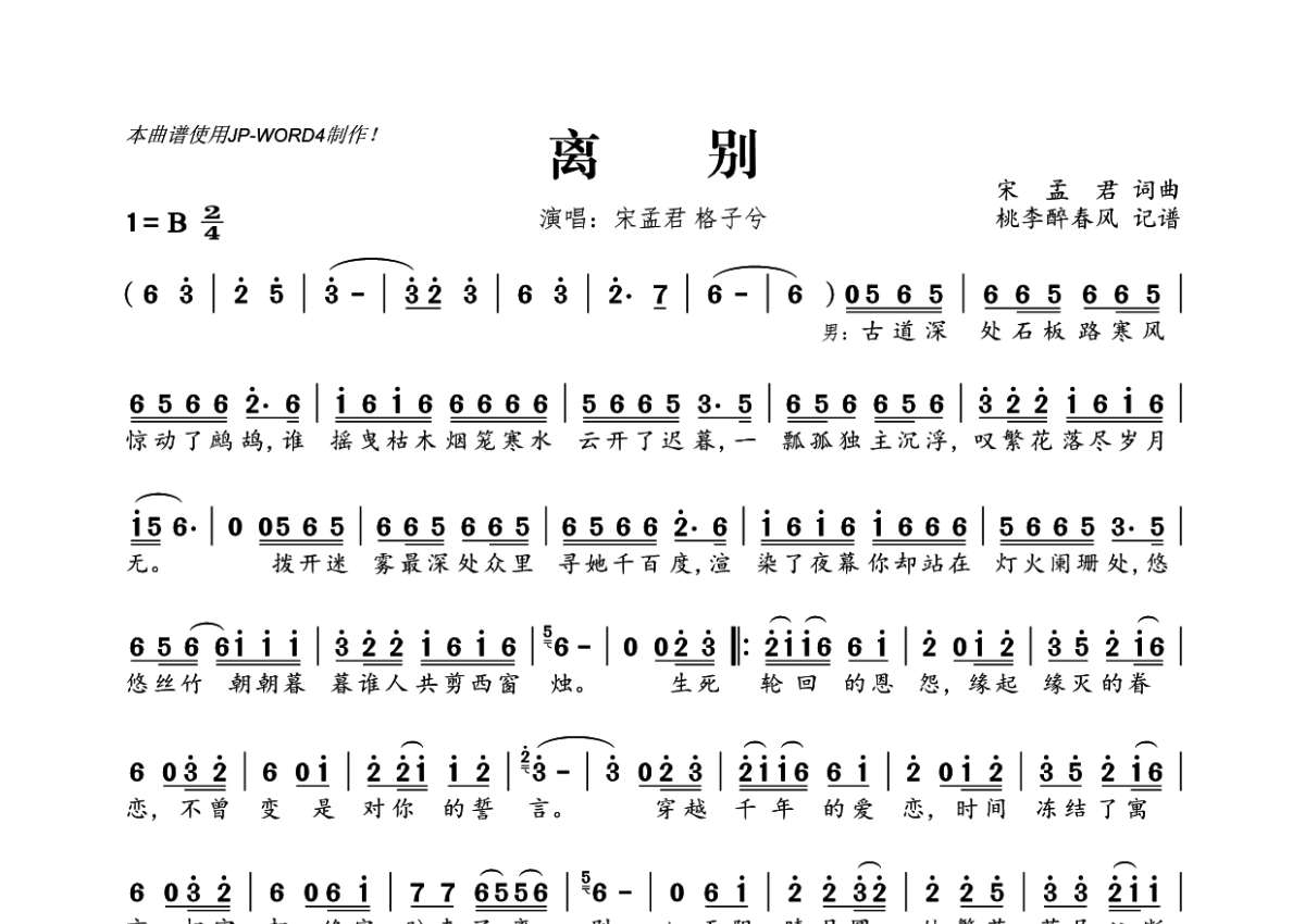 《离别》是宋孟君&格子兮演唱的一首歌曲,拍号为2/4拍,这份简谱共有一张高清图谱,图谱由 @桃李醉春风 编配上传。