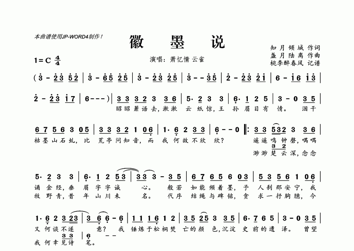 《徽墨说》是萧忆情演唱的一首歌曲,拍号为4/4拍,这份简谱共有一张高清图谱,图谱由 @桃李醉春风 编配上传。