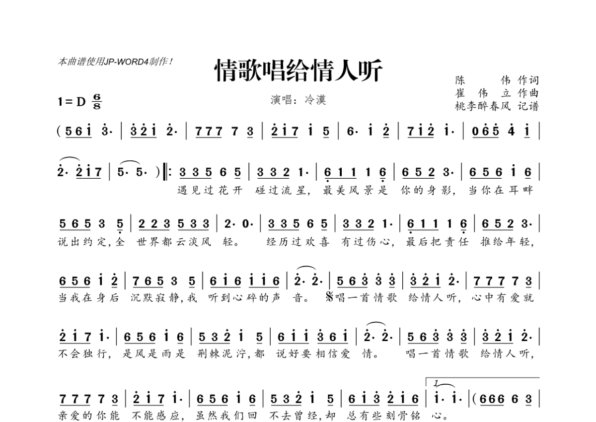 《情歌唱给情人听》是冷漠演唱的一首歌曲,拍号为6/8拍,这份简谱共有一张高清图谱,图谱由 @桃李醉春风 编配上传。