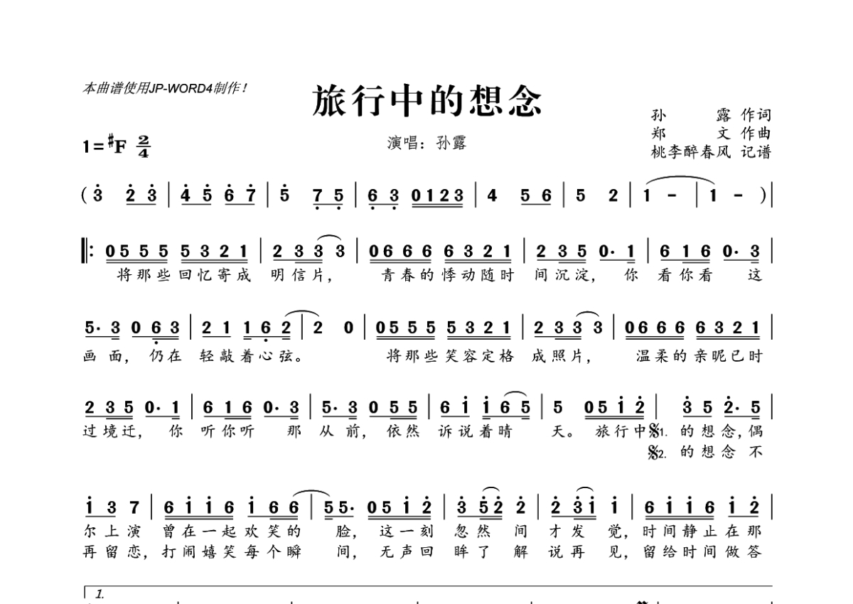 《旅行中的想念》是孙露演唱的一首歌曲,拍号为2/4拍,这份简谱共有一张高清图谱,图谱由 @桃李醉春风 编配上传。