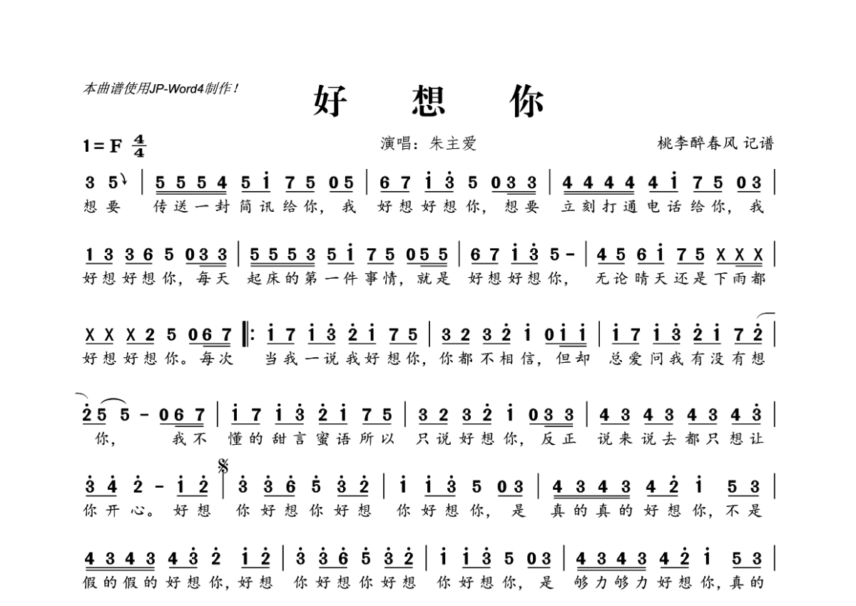 好想你简谱 - 朱主爱演唱