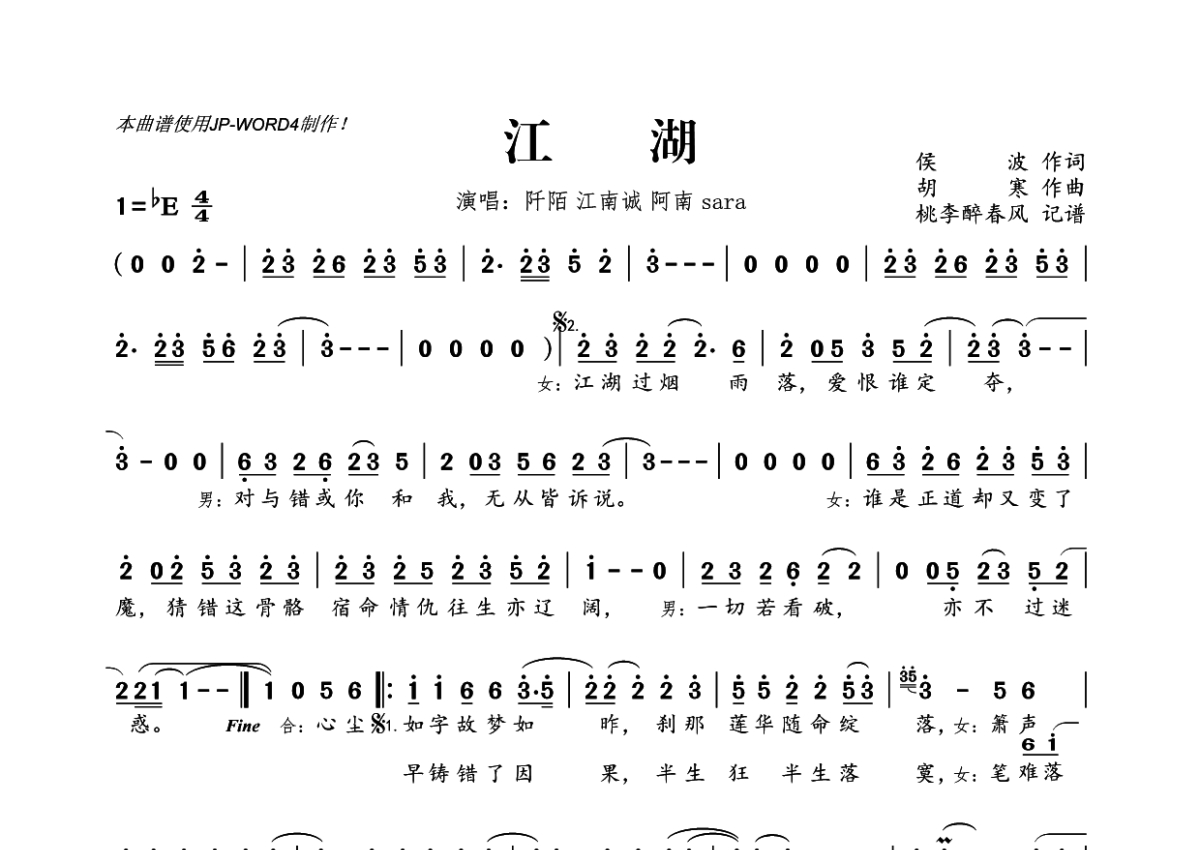 《江湖》是阡陌演唱的一首歌曲,拍号为4/4拍,这份简谱共有一张高清图谱,图谱由 @桃李醉春风 编配上传。