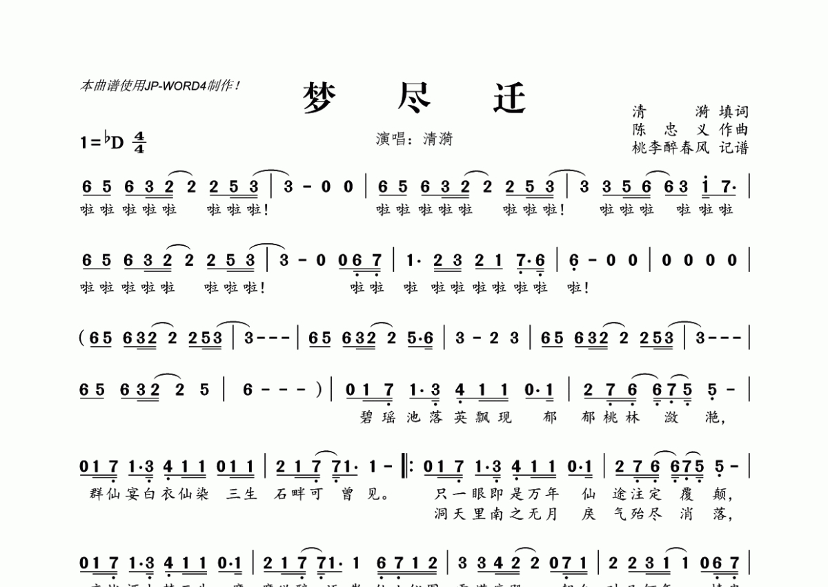 《梦尽迁》是清漪演唱的一首歌曲,拍号为4/4拍,这份简谱共有两张高清图谱,图谱由 @桃李醉春风 编配上传。