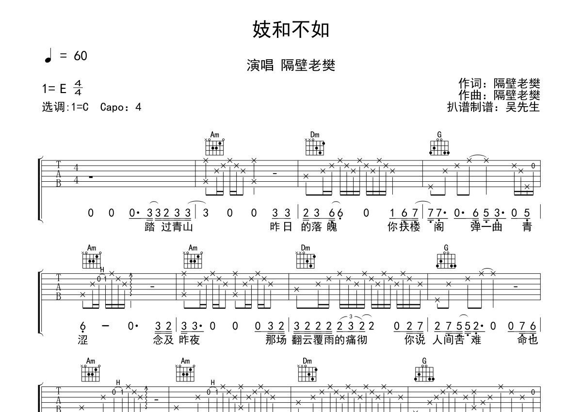 《妓和不如》是隔壁老樊演唱的一首歌曲,本吉他谱采用的是C调指法编配,这份吉他谱共有一张高清图谱,图谱由 @吴先生TAB 编配上传,图谱使用六线谱编配,包含吉他和弦指法、简谱以及歌词部分,使用这份妓和不如吉他谱,可以让你更加方便地掌握这首歌曲的弹唱技巧,快来尝试吧。原调E,选用C调指法,CAPO夹四品。那些因为缘分而来的东西终有缘尽而别的时候。一首热门的网络民谣歌曲,唱出一位歌姬内心的愁绪和寂寞,人间苦难,难逃折磨,相爱的两个人终究因为身份地位的社会框架而缘尽。万般皆由命,半点不由人,老樊的声音悲怆沧桑,犹如被岁月勾勒的荒凉。