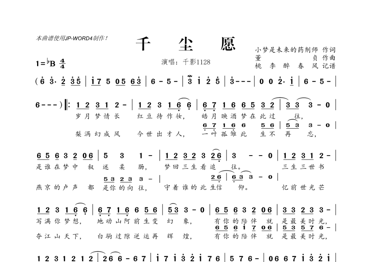 《千尘愿》是千影1128演唱的一首歌曲,拍号为4/4拍,这份简谱共有一张高清图谱,图谱由 @桃李醉春风 编配上传。