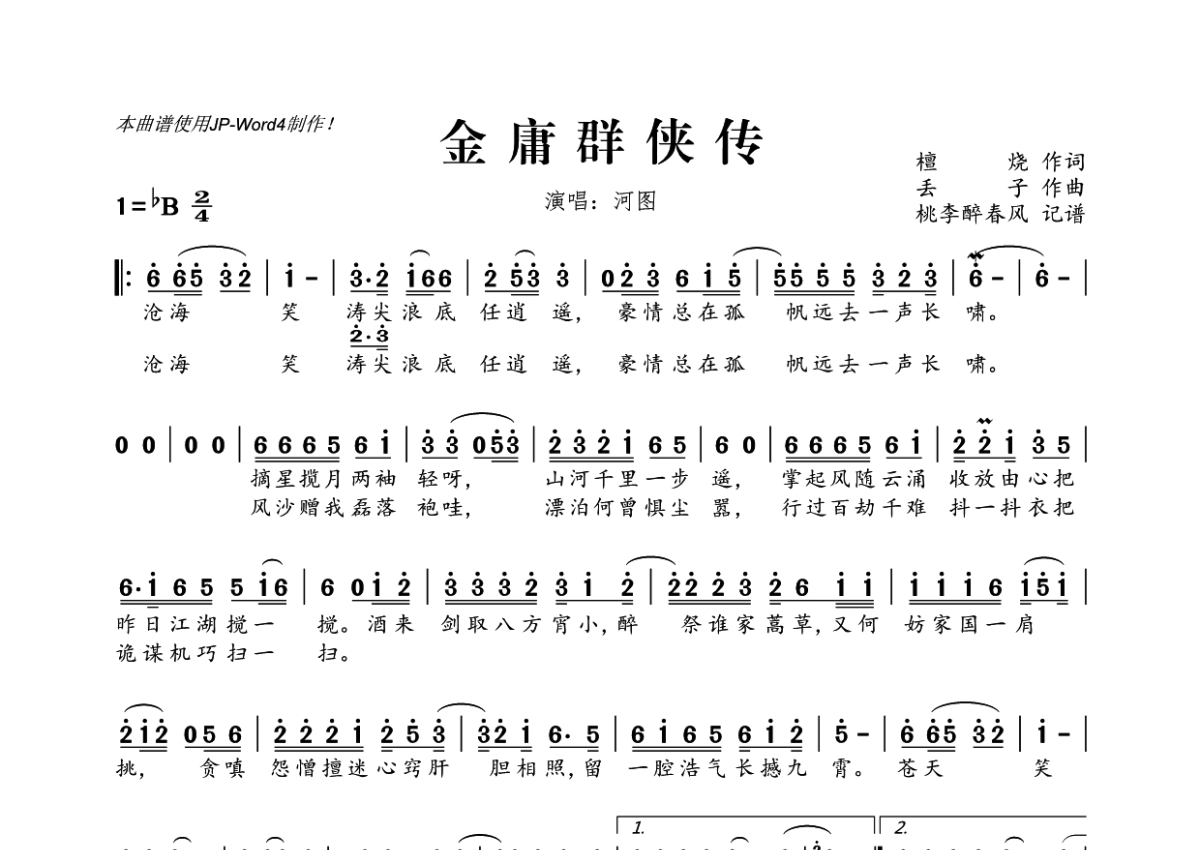 《金庸群侠传》是河图演唱的一首歌曲,拍号为2/4拍,这份简谱共有一张高清图谱,图谱由 @桃李醉春风 编配上传。