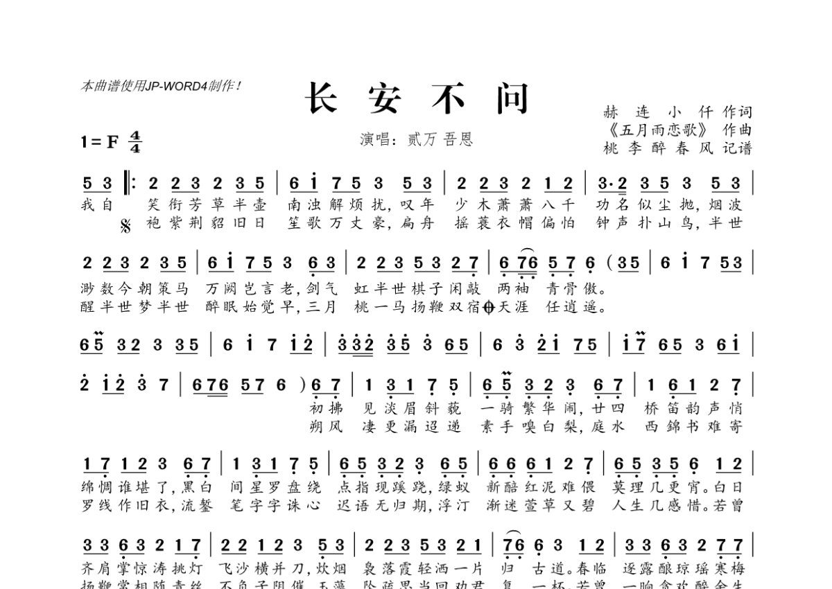 《长安不问》是贰萬&吾恩演唱的一首歌曲,拍号为4/4拍,这份简谱共有一张高清图谱,图谱由 @桃李醉春风 编配上传。