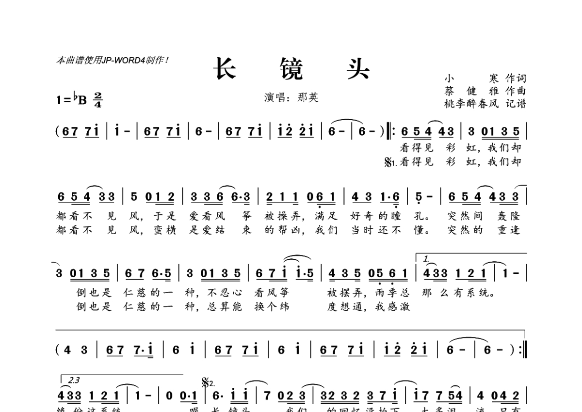 《长镜头》是那英演唱的一首歌曲,拍号为2/4拍,这份简谱共有一张高清图谱,图谱由 @桃李醉春风 编配上传。
