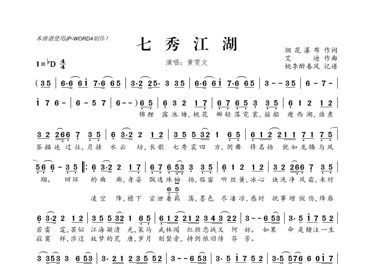 《七秀江湖》是黄雯文演唱的一首歌曲,拍号为4/4拍,这份简谱共有一张高清图谱,图谱由 @桃李醉春风 编配上传。