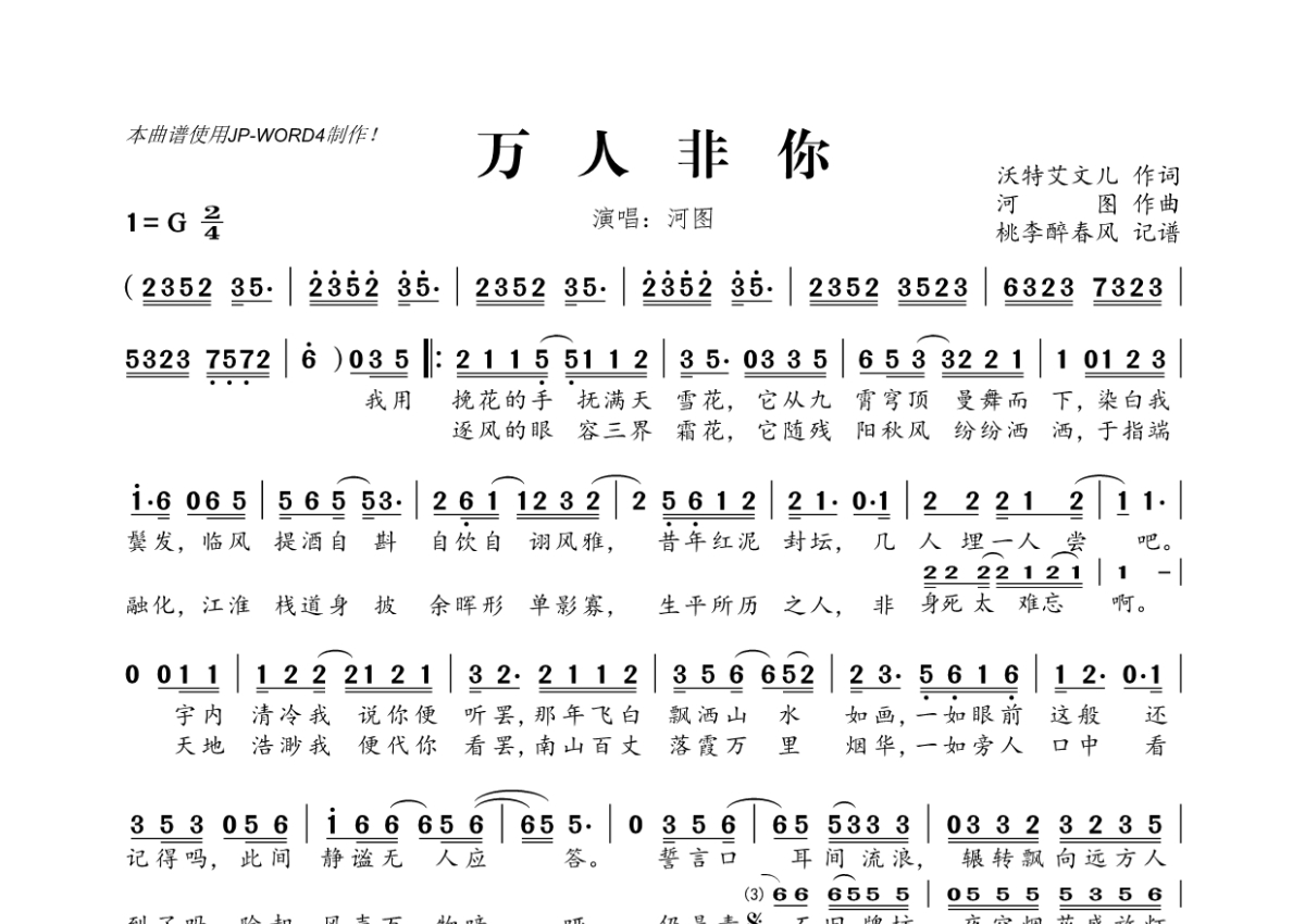 《万人非你》是河图演唱的一首歌曲,拍号为2/4拍,这份简谱共有一张高清图谱,图谱由 @桃李醉春风 编配上传。
