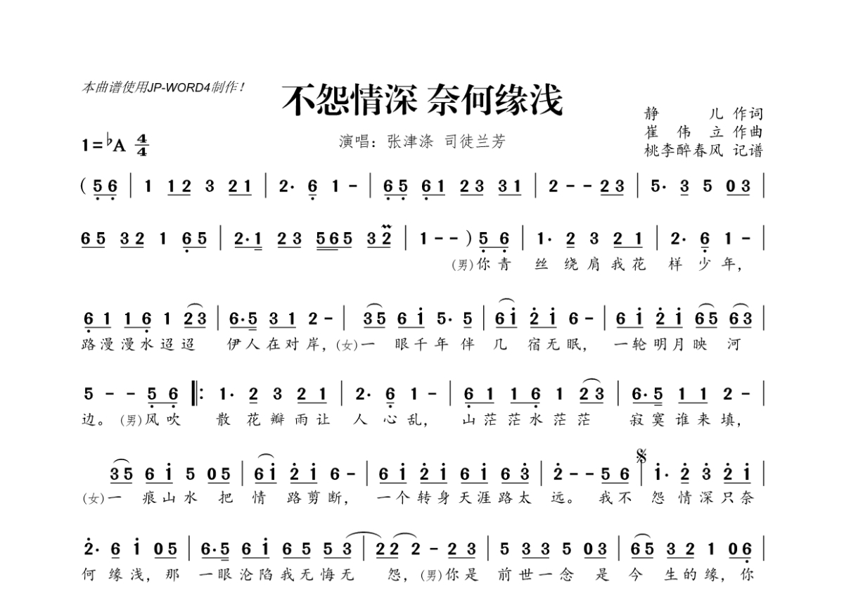 《不怨情深 奈何缘浅》是张津涤&司徒兰芳演唱的一首歌曲,拍号为4/4拍,这份简谱共有一张高清图谱,图谱由 @桃李醉春风 编配上传。