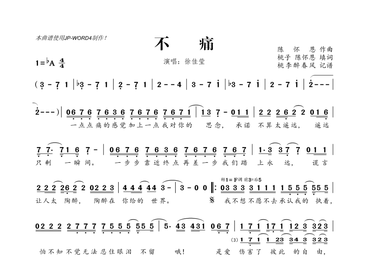 《不痛》是徐佳莹演唱的一首歌曲,拍号为4/4拍,这份简谱共有两张高清图谱,图谱由 @桃李醉春风 编配上传。