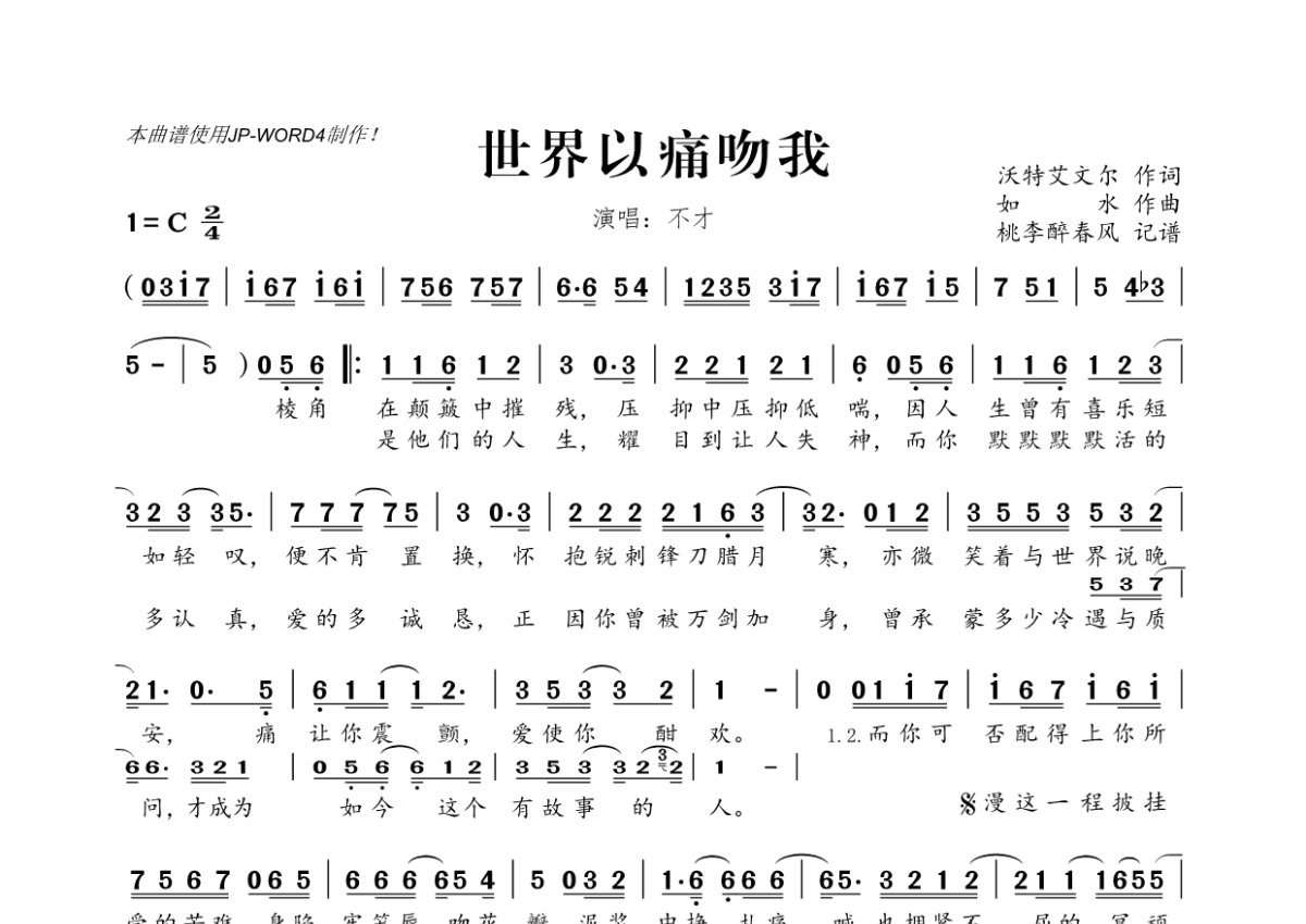 《世界以痛吻我》是不才演唱的一首歌曲,拍号为2/4拍,这份简谱共有一张高清图谱,图谱由 @桃李醉春风 编配上传。