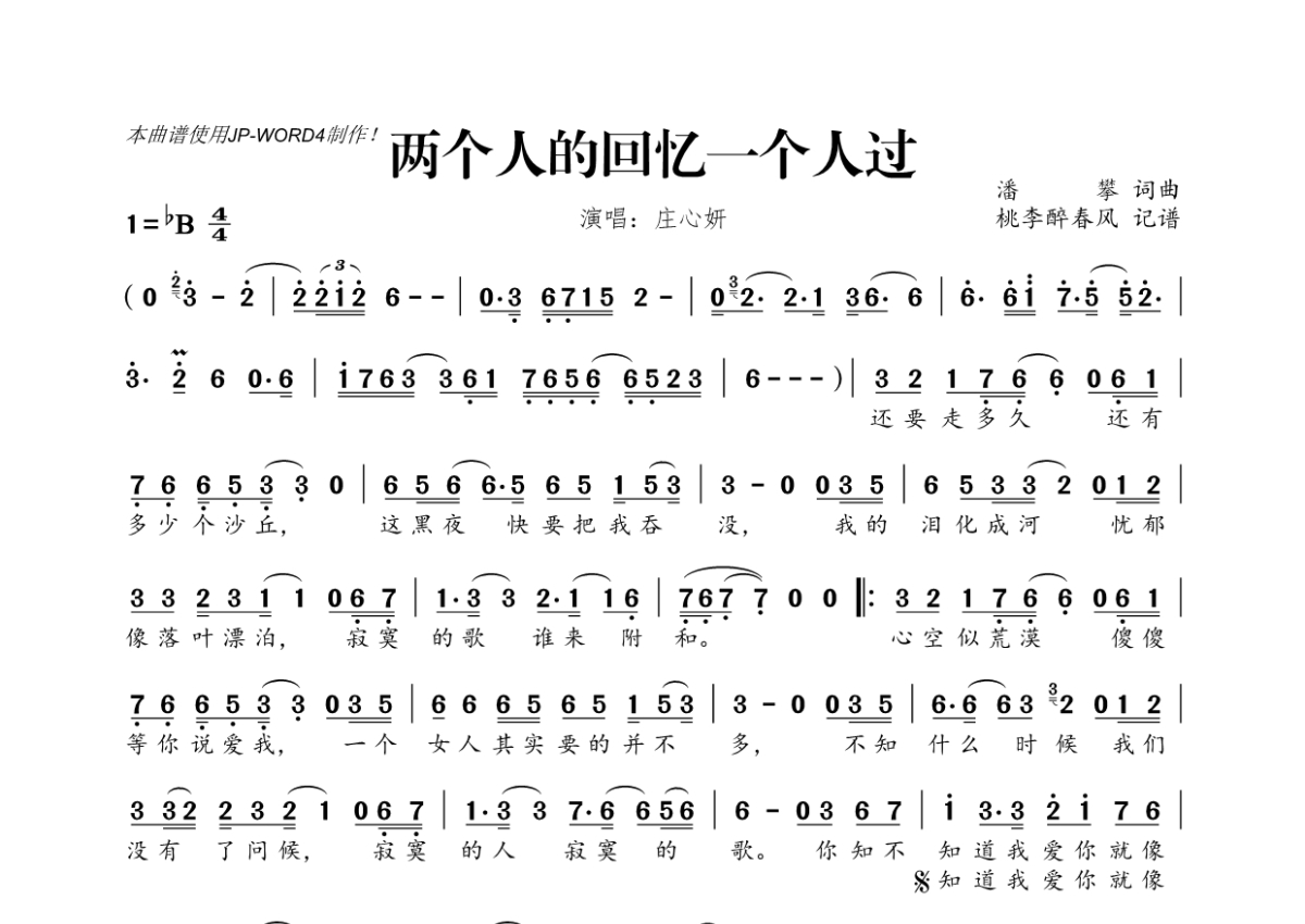 《两个人的回忆一个人过》是庄心妍演唱的一首歌曲,拍号为4/4拍,这份简谱共有一张高清图谱,图谱由 @桃李醉春风 编配上传。
