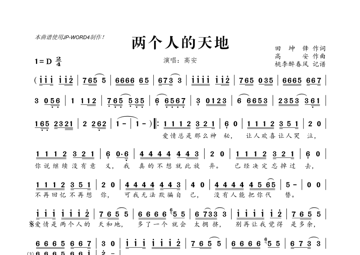 《两个人的天地》是高安演唱的一首歌曲,拍号为2/4拍,这份简谱共有一张高清图谱,图谱由 @桃李醉春风 编配上传。