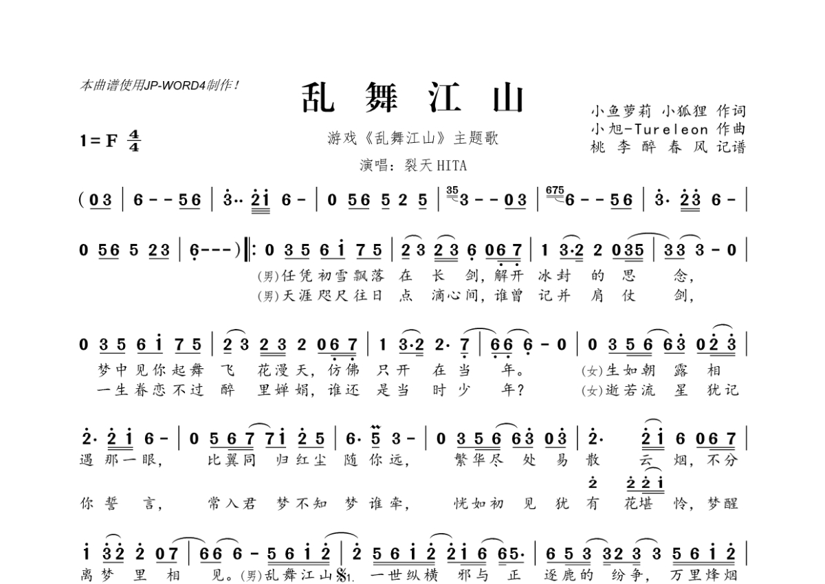 《乱舞江山》是HITA演唱的一首歌曲,拍号为4/4拍,这份简谱共有一张高清图谱,图谱由 @桃李醉春风 编配上传。