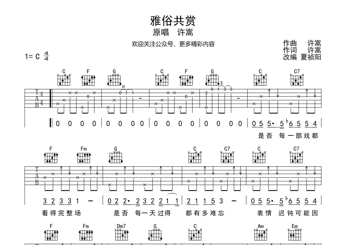 许嵩《雅俗共赏》吉他谱 - C调弹唱六线谱