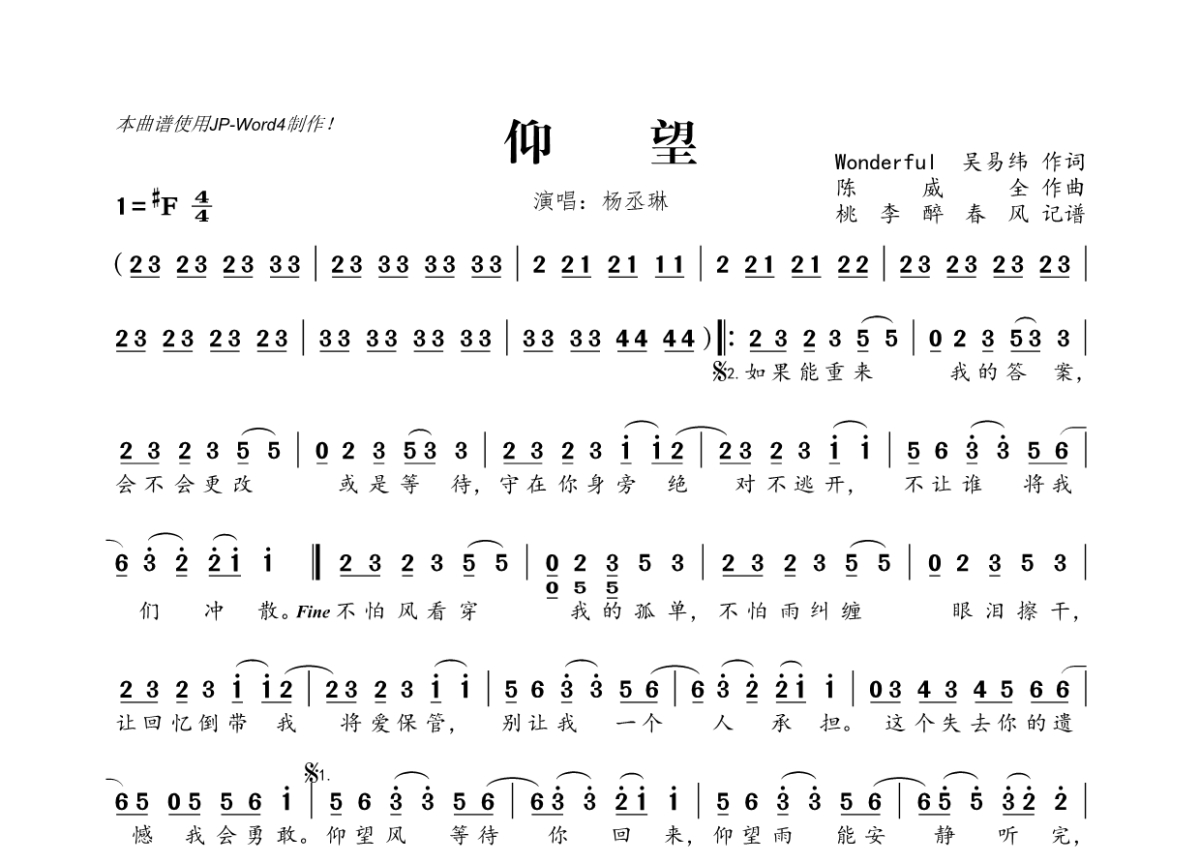 《仰望》是杨丞琳演唱的一首歌曲,拍号为4/4拍,这份简谱共有一张高清图谱,图谱由 @桃李醉春风 编配上传。