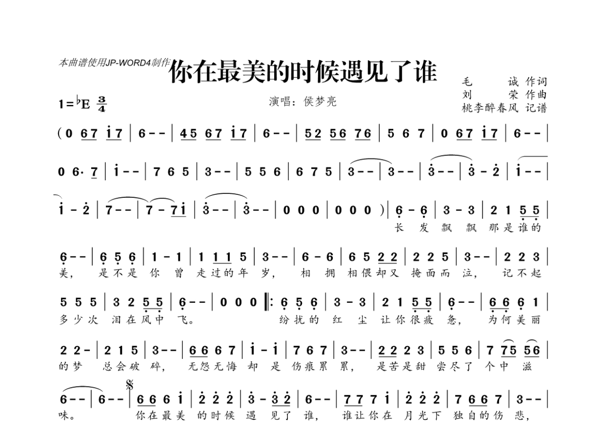 侯梦亮《你在最美的时候遇见了谁》简谱