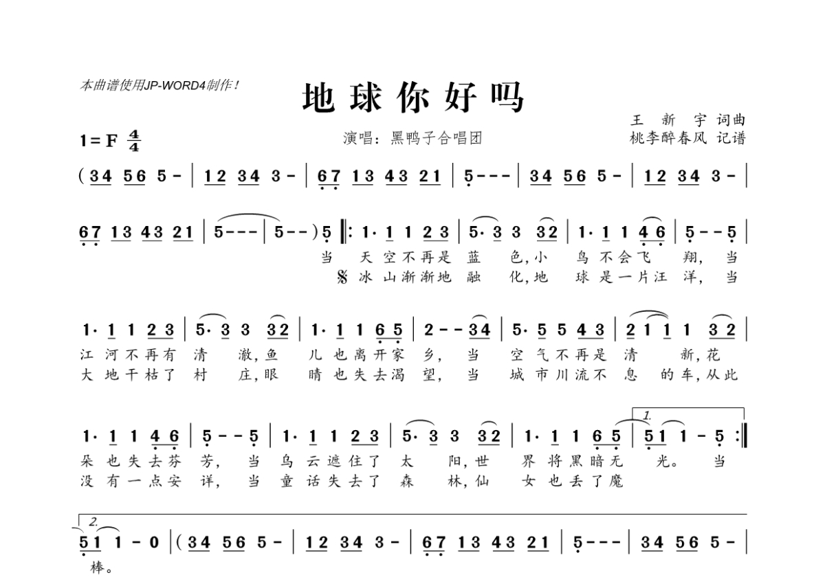 《地球你好吗》是黑鸭子演唱组演唱的一首歌曲,拍号为4/4拍,这份简谱共有一张高清图谱,图谱由 @桃李醉春风 编配上传。