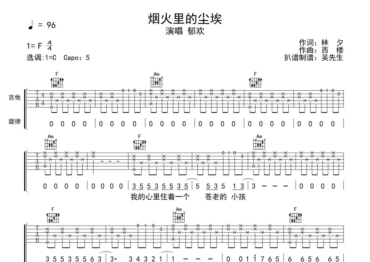 《烟火里的尘埃》是郁欢演唱的一首歌曲,女生版,本吉他谱采用的是C调指法编配,这份吉他谱共有两张高清图谱,图谱由 @吴先生TAB 编配上传,图谱使用六线谱编配,包含吉他和弦指法、简谱以及歌词部分,使用这份烟火里的尘埃吉他谱,可以让你更加方便地掌握这首歌曲的弹唱技巧,快来尝试吧。烟火里的尘埃吉他谱,郁欢演唱女生版,原调F,选调C,CAPO夹五品。华晨宇的一首代表作品,烟火里的尘埃六线谱,高清弹唱图片谱最好听的女生翻唱,也是抖音很火的版本。你是白日里的焰火,我是烟火里的尘埃,只为绚烂里的平凡。