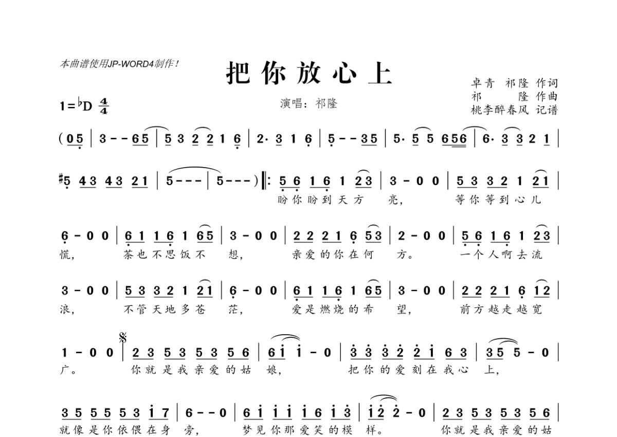 《把你放心上》是祁隆演唱的一首歌曲,拍号为4/4拍,这份简谱共有一张高清图谱,图谱由 @桃李醉春风 编配上传。