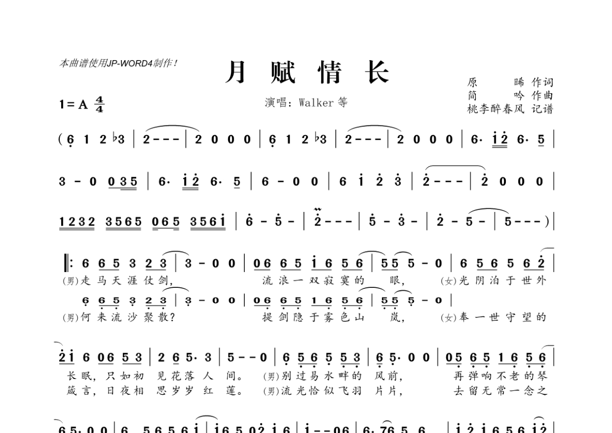 《月赋情长》是WALKER&HITA&横颜君&阡陌演唱的一首歌曲,拍号为4/4拍,这份简谱共有两张高清图谱,图谱由 @桃李醉春风 编配上传。