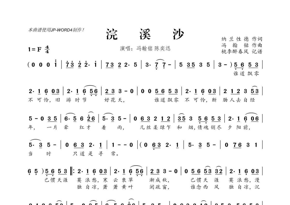 《浣溪沙》是陈奕迅演唱的一首歌曲,拍号为4/4拍,这份简谱共有一张高清图谱,图谱由 @桃李醉春风 编配上传。