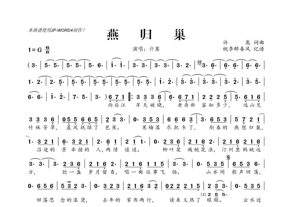 《燕归巢》是许嵩演唱的一首歌曲,拍号为6/8拍,这份简谱共有一张高清图谱,图谱由 @桃李醉春风 编配上传。