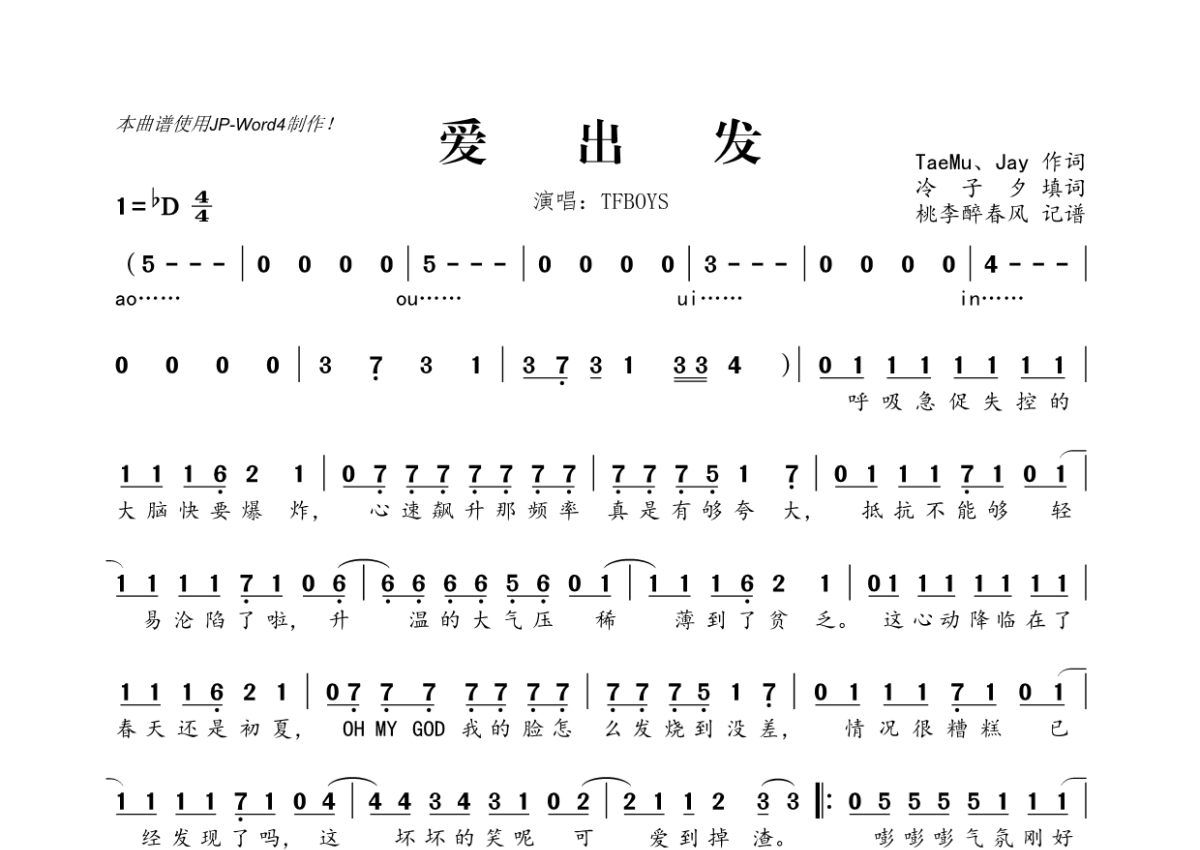 爱出发简谱 - TFBOYS演唱