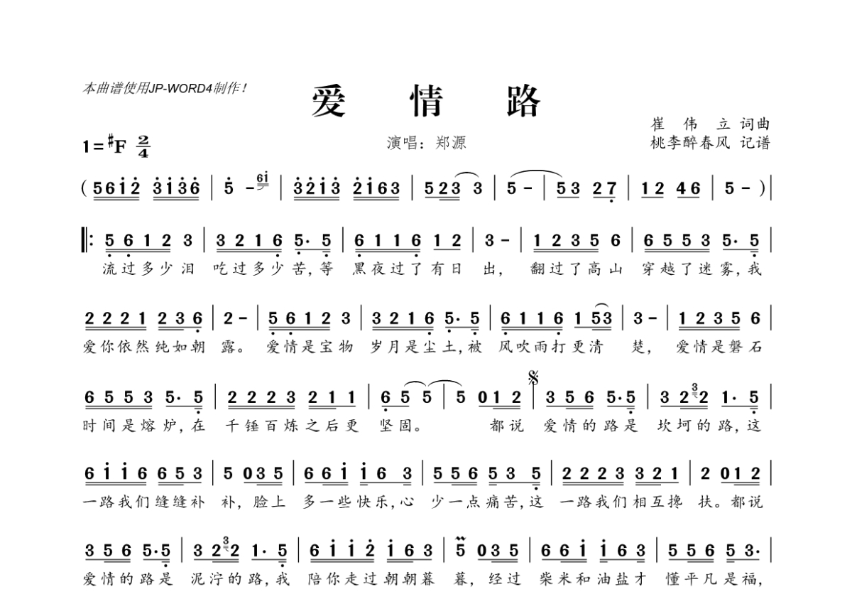 《爱情路》是郑源演唱的一首歌曲,拍号为2/4拍,这份简谱共有一张高清图谱,图谱由 @桃李醉春风 编配上传。