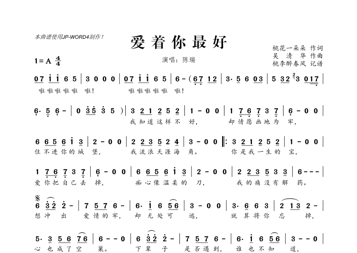 《爱着你最好》是陈瑞演唱的一首歌曲,拍号为4/4拍,这份简谱共有一张高清图谱,图谱由 @桃李醉春风 编配上传。