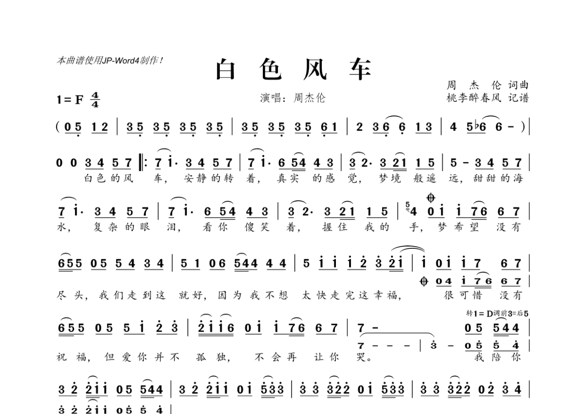 周杰伦《白色风车》简谱
