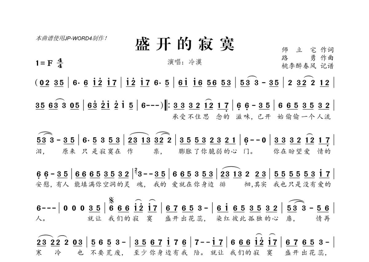 《盛开的寂寞》是冷漠演唱的一首歌曲,拍号为4/4拍,这份简谱共有一张高清图谱,图谱由 @桃李醉春风 编配上传。