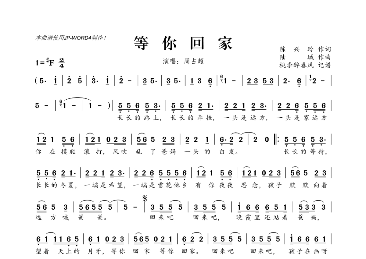 《等你回家》是周占超演唱的一首歌曲,拍号为2/4拍,这份简谱共有一张高清图谱,图谱由 @桃李醉春风 编配上传。